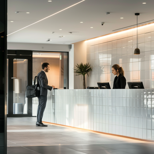 businessman walking up, white tiled concierge counter with a female staff wearing uniform, angled view