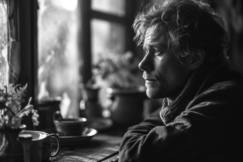 photo of a caucasian marathon runner, sitting by the table, meditating, black and white, dramatic, noise --ar 3:2 --v 6.0 --s 750