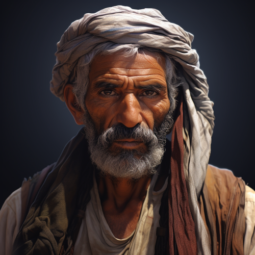 A close-up shot of an African man with deep wrinkles, his eyes wide open in fear and determination as he sits at the center stage. He is wearing traditional attire that reflects his cultural heritage. The lighting casts dramatic shadows on him from above, emphasizing his facial expressions. This portrait captures intense emotions, showcasing intricate details like sweat beads on his skin texture, and vibrant colors of his against a dark background. uhd. --ar 16:9