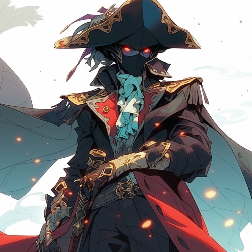 Anime alien pirate captain, bombastic and broad shouldered, a hint of dashing yet a scoundrel, elaborately adorned with a cape, evangelion and ARTMIC aesthetic --niji 5