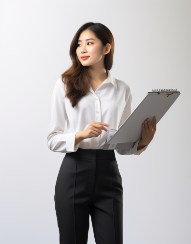 attractive asian business woman, modern city clothes, looking at a presentation in a meeting, white background, --ar 35:45
