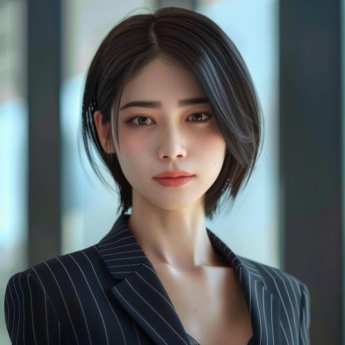 fit slim short haired tanned Chinese woman surfer in a business suit manga style passionate slightly rounded eyes rounded nose wider mouth wild and sassy demeanor hyper realistic promotional photography lovely bold smile