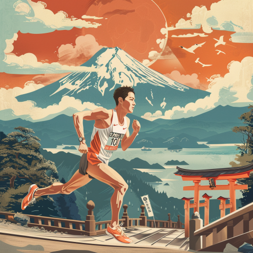 Here is an illustration of a runner swiftly racing in the Hakone Ekiden, capturing the determination and energy of the event along with iconic Japanese scenery. --v 6.0