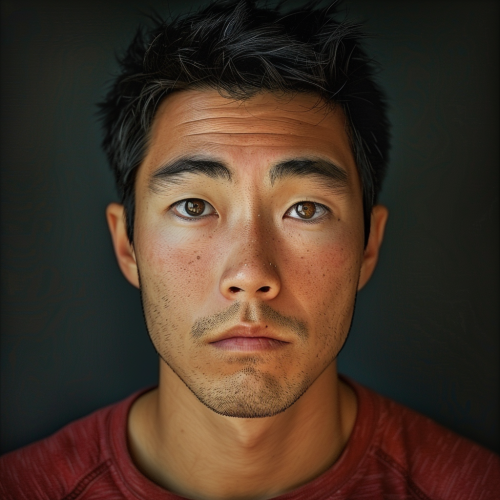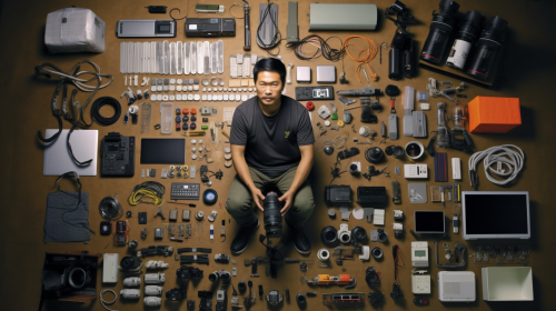 one man asian agency workers with laptop cameras and supporting equipment. portrait photo, men in left, 8k, escription with knolling parts, main color # ff7ad2, knolling, photorealistic, 8k, shot from above, with text description, data visualization --ar 16:9 --s 750 --v 5.1