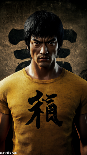 Cinematic shot of Bruce Lee in a yellow t-shirt, with black hair and a Chinese character on the wall behind him, "Bigmì tròu hái", photorealistic, detailed skin texture, detailed eyes, detailed background, from above, solid black background, made of diamond, monochrome, insanely detailed, furious, Chiaroscuro --ar 9:16