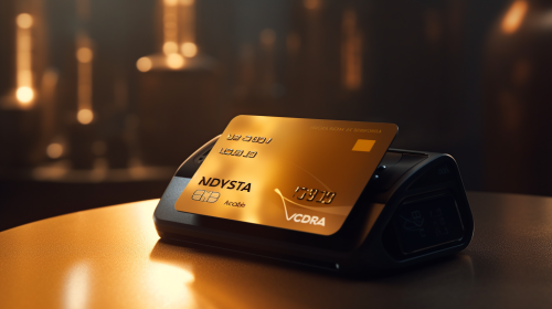 closeup of a futuristic visa credit card reader, no people, cinematic and theatrical style lighting, warm luxury but mainly golden lights blade runner vibe, minimalist in style, rick owens furniture 4K --ar 16:9