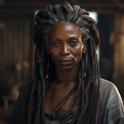 the kind black mature woman with dreads from the book the shack kindly looking at me photorealistic shot high quality in the style Rick Owens HD 16k