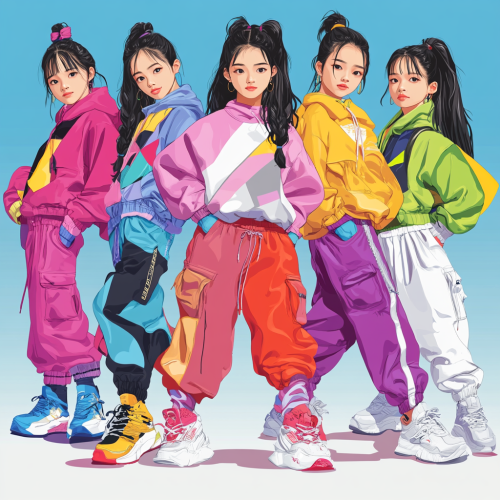 Realistic illustration style, a group of Asian teenage girls with different hairstyles, each wearing unique colorful streetwear outfits and shoes, full body view, ultra detailed, minimalist background --p pn1eq8j
