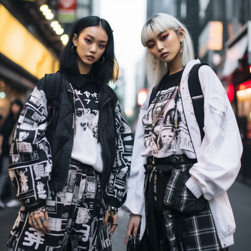 asian women wearing japanese street wear, hype beast clothing, mainly black and white, lots of accessories
