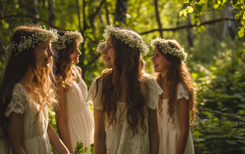 Three teenage scandinavian girls standing together outside their school at night, engaged in a casual conversation. Each girl carries a shoulder purse with a silk scarf tied to the strap, where the strap meets the bag. The scarves have reflective, iridescent colors that catch and shimmer in the dim evening light. The school building looms quietly in the background, with a few faint lights illuminating the scene. The mood is warm and friendly, capturing the bond of friendship on a quiet evening.