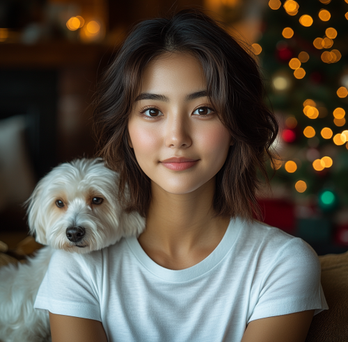 White t-shirt design,Asian woman sitting on sofa casually or relaxing, looking at camera and smiling. She has short hair, the front of her t-shirt is clearly visible and straightened. She is wearing light pants. In the background is a cozy living room decorated for Christmas. A white dog is sitting at her feet. Award-winning photography --ar 51:50 --style raw --s 750