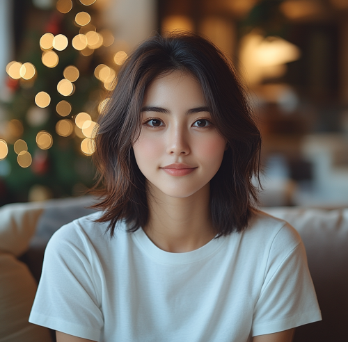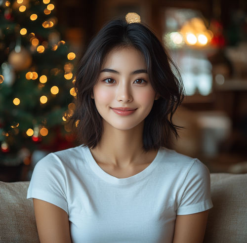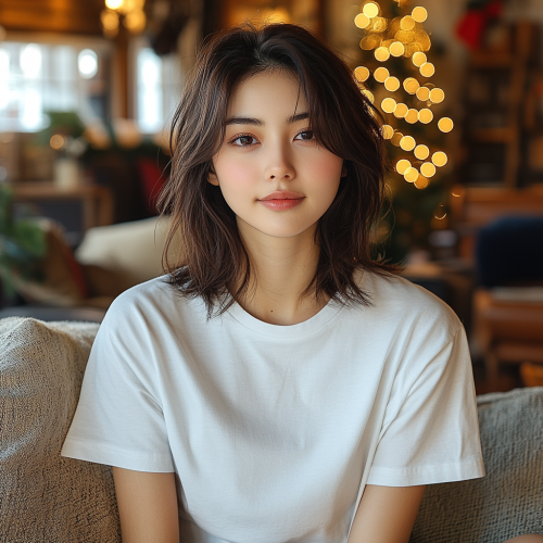 White t-shirt design,Asian woman sitting on sofa casually or relaxing, looking at camera and smiling. She has short hair, the front of her t-shirt is clearly visible and straightened. She is wearing light pants. The background shows a cozy living room decorated for Christmas.Award-winning photography. Medium shot --ar 51:50 --style raw --s 750
