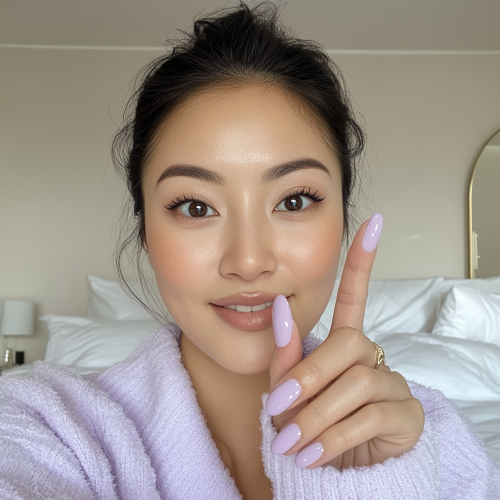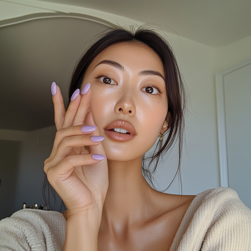 a photo of an candid asian woman with 5 fingers on each hand showing off her new nails that are painted with glossy lilac lavender colour, the nails are shaped in a short round shape. She is wearing a beige top. The photo looks candid like it's from an influencer taking a selfie in her bedroom but in the style of aritzia. Canon camera with an aperture of 5.2