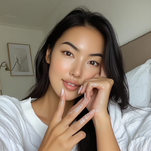 a photo of an candid asian woman with 5 fingers on each hand showing off her new nails that are painted with a very fine shimmery colour, the nails are shaped in a short almond shape. The photo looks candid like it's from an influencer taking a selfie in her bedroom but in the style of aritzia. Canon camera with an aperture of 5.2
