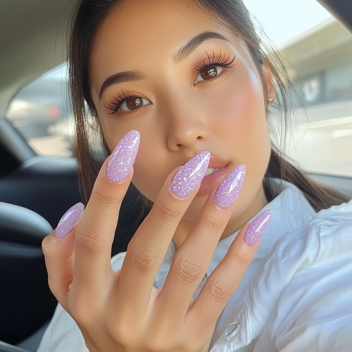a photo of an candid asian woman with 5 fingers on each hand showing off her new nails that are painted with shimmery light lavender colour, the nails are shaped in a short round almond shape. The photo looks candid like it's from an influencer taking a selfie in her bedroom but in the style of aritzia. Canon camera with an aperture of 5.2