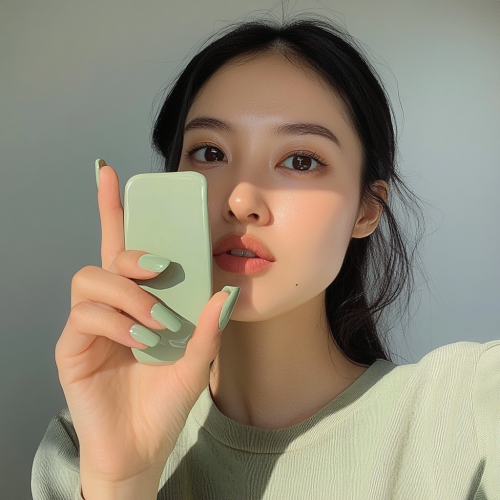 a photo of an candid asian woman with 5 fingers on each hand showing off her new nails that are painted with a shimmery sage green color, the nails are shaped in a short square shape. the woman is wearing a beige top. The photo looks candid like it's from an influencer taking a selfie in her bedroom but in the style of aritzia. Canon camera with an aperture of 5.2