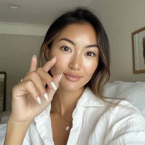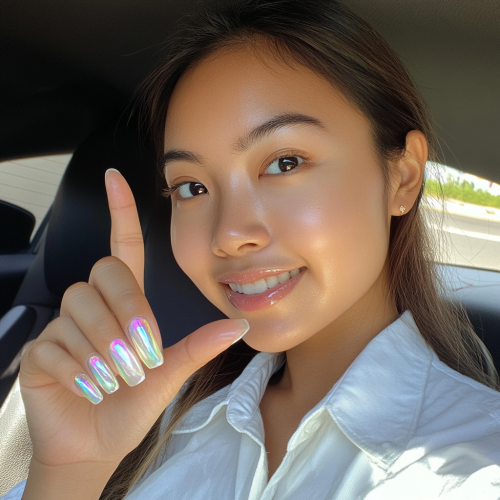a photo of an candid asian woman with 5 fingers on each hand showing off her new nails that are painted with glossy white iridescent colour, the nails are shaped in a short rounded square shape. She is wearing a casual white button up top. The skin on her face has some texture and pores. The photo looks candid like it's from an influencer taking a selfie in her car but in the style of aritzia. Canon camera with an aperture of 5.2