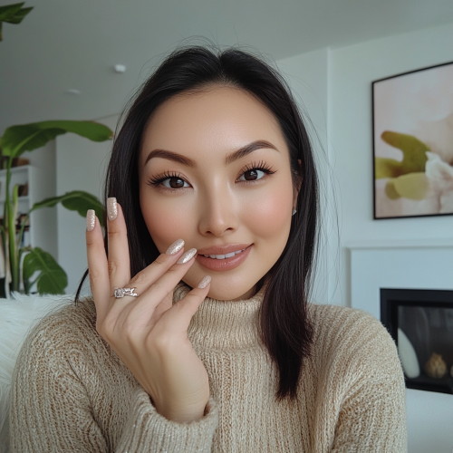 a photo of an candid asian woman with 5 fingers on each hand showing off her new nails that are painted with a very fine shimmery champagne colour, the nails are shaped in a short almond shape. The photo looks candid like it's from an influencer taking a selfie in her bedroom but in the style of aritzia. Canon camera with an aperture of 5.2