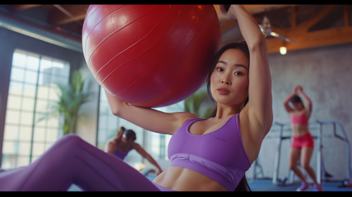 Still image from a Samsung commercial, in the foreground we see a Beautiful young asian woman wearing a purple outfit, she is laying on her back on a yogamat doing situps while holding a big red ball above her hed, the Location is inside a premium modern gym, in the background we see young asian people doing different workouts, shot on Panavision sphere 65 and Hasselblad lenses, ultra wide-angled lenses, Kodak Vision 250D, Panavision Super 70, IMAX MKII --ar 16:9 --v 6.0 --style raw