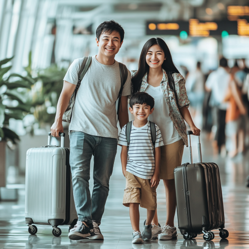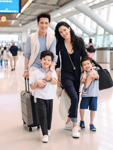 A family of three from Asia, a 42-year-old man with a tall and slim build, an engineer dressed in casual clothes; a 34-year-old woman, a designer with long black hair, wearing stylish attire; a cute 7-year-old boy with a bright smile; they are at the airport, dragging their suitcases, with the background featuring the boarding gate and travelers, creating a vibrant travel atmosphere, sunny and warm tones。--v 6.1