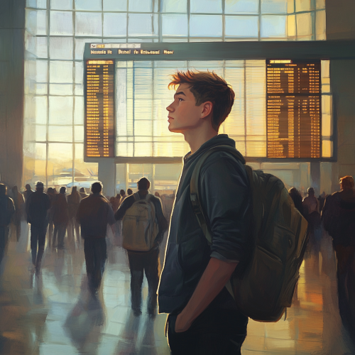 A sunny day, A family of three from Asia, a 42-year-old man with a tall and slim build, an engineer dressed in casual clothes; a 34-year-old woman with long black hair, wearing stylish attire with an elegant figure, a cute 7-year-old boy with a bright smile; they are at the airport, dragging their suitcases, with the background featuring the boarding gate and travelers, creating a vibrant travel atmosphere, sunny and warm tones,Asian Illustration style,the students are listening attentively,watercolor ink painting, 4K, Soft illumination --niji 5 --ar 3:4