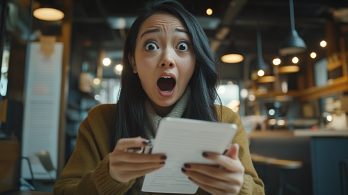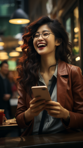 asian woman holding phone and take notes about her finance , cafe ambience background, excited facial expression, various angle , unreal gesture, super long shot, ultra realistic, --ar 16:9