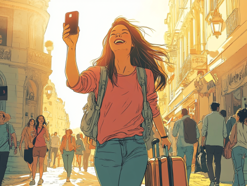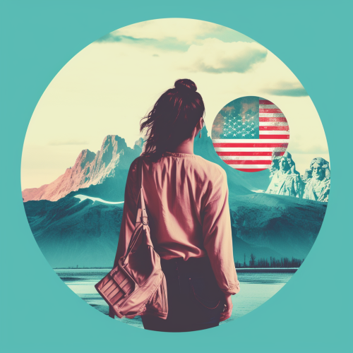 logo instagram, back woman traveling looking at united states flag, background color teal