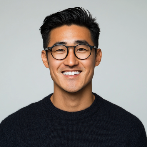Create a portrait of an East Asian man in his late 20s, with short, neat black hair and glasses. He is wearing a stylish dark sweater and smiling warmly. The background is plain white, emphasizing his approachable and customer-focused personality.