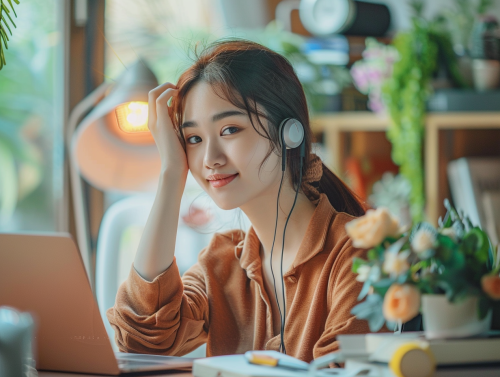 A stylish wireless Bluetooth earphone on a desk, surrounded by various objects, held by an Asian model, matte black finish, comfortable to wear, powerful noise cancellation, rich in detail, lifelike effect, shot with Canon EOS R5, close-up shot of the earphone, simple background, highlighting the product --ar 4:3 --v 6.0