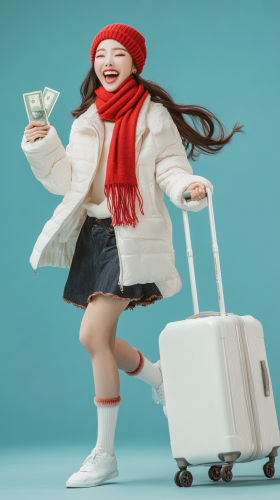 Full body of a 33 years old rich Asian Korean beautiful woman with long dark brown hair, white bright skin and wearing chic fashion white color jacket and red scarf and beanie hat and long dark denim ankle lenght skirt with socks like in winter season and white sneaker is handing a money banknotes on one hand and right hand holding travel white suitcase next to her and run forward with exciting laughing and overacting smile, she is fashionista, she going to travel abroad with exciting feeling, pastel blue studio background ,commercial photography, lively scene, --ar 9:16
