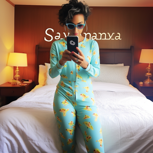 style: snapchat photo. a married woman influencer pose for summer two piece pyjamas log book