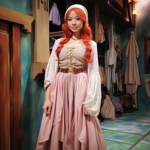 woman, cute, slightly Asian in appearance, light pink hair with light bangs. Dressed in the dress of a peasant woman from the Middle Ages. Standing in full height in the theater dressing room