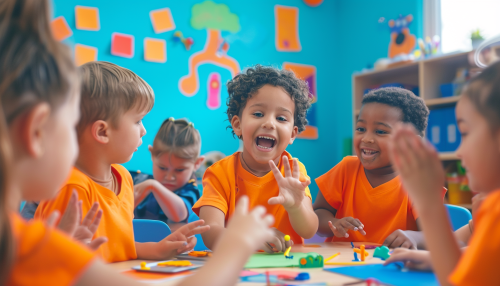 a lively classroom setting in a K-12 education context, where young students, elementary-aged, are engaged in a hands-on learning activity. They are using American Sign Language, as deaf students. The children are seated around a table, interacting with various educational tools or manipulatives. Their bright orange shirts suggest that they may be part of a themed activity or a specific group within the classroom. There are colorful educational materials leaning against the wall behind them. Shot with a Nikon AF-S DX Nikkor 35mm f/1.8g lens, lit by daylight, photo --v 6.0 --ar 7:4