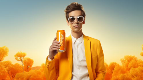 a socially and environmentally minded gen Z social influencer holding the latest energy drink, orange tone, photo realistic, --ar 16:9