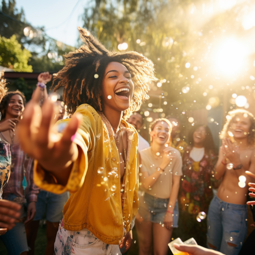 A casual backyard party that is lively and full of energy. Men and women from Gen Z are dressed in trendy, unusual outfits, holding canned drinks. They look like characters from the HBO show, "Euphoria." They look like Billie Eilish and Jaden Smith. They are dancing together, creating memories, having fun and laughing. Lighting at the party is dreamy and euphoric, casting an otherworldly aura over the festivities. The backdrop isn't in-focus. There is a camera flash which gives the photo a raw / realistic feeling. The photo does not look like a stock photo. It is a high-resolution image. It encapsulates the wild and untamed spirit of these unconventional revelers, inviting onlookers to join in the chaos and celebrate their eccentricity. Camera Setup: Camera: Fujifilm X-T4 Mirrorless Lens: Fujifilm XF 23mm f/1.4 R Resolution: 26.1 megapixels ISO Sensitivity: ISO 800 Shutter Speed: 1/250 sec Aperture: f/2.0.