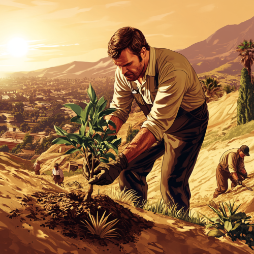 A farmer in rugged work clothes, diligently planting a young tree in a sunlit field, set in the vibrant and exaggerated Grand Theft Auto V art style. The farmer has a determined yet content expression, surrounded by rich soil and gardening tools. In the background, other farmers are engaged in various agricultural activities, showcasing a sense of community and teamwork. Farther back, the rolling hills and distant landscape of Los Santos can be seen, bathed in the warm glow of midday sun. The scene features bold outlines, lush colors, and a cinematic feel, capturing the lively and spirited atmosphere of GTA V.