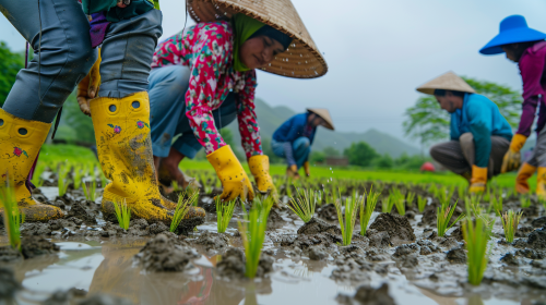 A group of Iranian farmers working in the rice field, wearing colorful and straw hats planting seedlings. The background is green grasslands with trees and gray sky. In close-up shots, they wear shoes made from yellow rubber gloves on their feet. They plant rice seeds into small holes in the mud using wooden tools. High definition photography photos --ar 16:9 --v 6.0