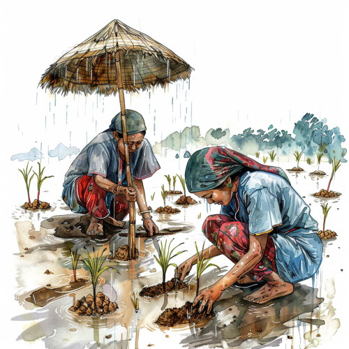 Khasi farmers with their traditional 'Knup' (bamboo hat) planting paddy seedlings in monsoon rain in Shillong, capital of Meghalaya. 2D Illustrstion. White Background. --v 6.0