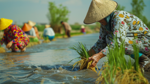 Many people in Iran wear printed and colorful outfit with straw hat, wearing leather shoes on their feet to plant rice seedlings by the river. The scene is captured in wide-angle, high-definition photography, with a documentary-style approach. They are planting rice seedlings. - Image #3 in the scene, 4K resolution --ar 16:9 --v 6.0