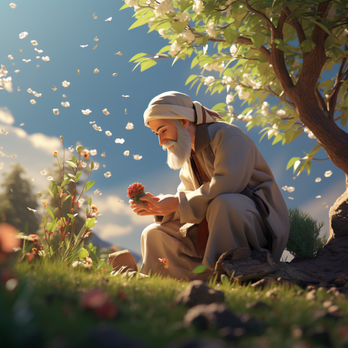 a pleasant and charismatic inhabitant of the Caucasus of the 13th century, a beautiful picture in which Hein in the national Caucasian outfit plants a tree in the garden, a simple avatar, 3d rendering, cartoon, popmart, hyperrealistic style, --s 250