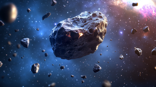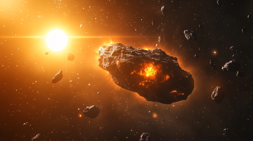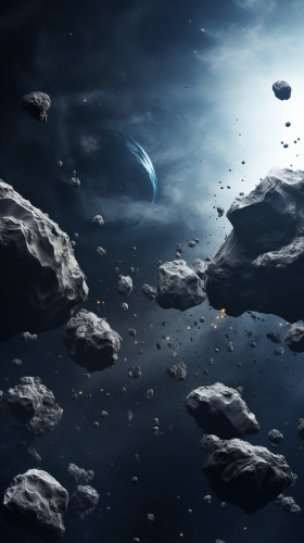 The Dimorph asteroid is flying through black space, there are many stone fragments of different shapes and sizes around and behind it, it is beautiful, stars are burning in the distance, planets and the Sun in the background, 8k, HD, realism, clear photo --ar 16:9