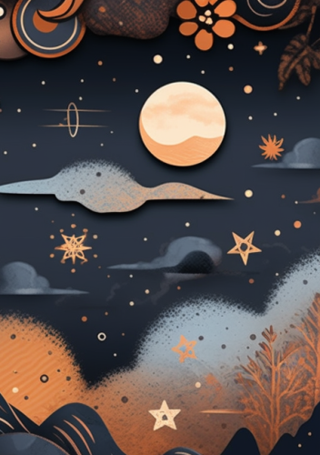 Craft an enchanting illustration where the celestial elements take center stage--a vast sky adorned with myriad stars and a colossal, luminous moon dominating the canvas. Utilize graceful, swirling lines to depict the celestial dance of stars and the moon's radiant presence, filling most of the illustration. Illustrate the moon as a captivating focal point, radiating its soft, ethereal glow across the expanse. Let the stars twirl and spiral in whimsical patterns around the moon, creating a celestial symphony against the night sky. Beneath this cosmic display, portray a lush jungle embraced by the moonlight's gentle touch. Employ intricate yet fluid lines to outline the foliage and trees, capturing the dreamlike quality of the nighttime scenery. Utilize a captivating illustration style that merges the cosmic beauty of the sky with the enchanting details of the jungle below, blending the fluidity of the celestial lines with the intricacies of the jungle's foliage. --ar 16:9 --v 6.0