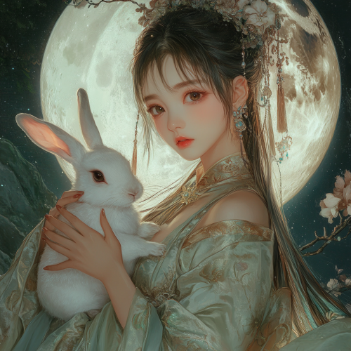 beautiful chang e holding a cute rabbit, standing next to a big moon. detaled beautiful clothes, in the style of rococo-inspired art, candycore, yanjun cheng, 32k uhd, close up, lively brushwork, shiny eyes