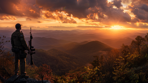 Create a hyper-realistic cinematic photo in the style of the Sitka brand of a hunter standing tall holding an AR15 looking out at a beautiful sunset from the highest point in the smokey mountains, high resolution, --ar 16:9 --v 6.0