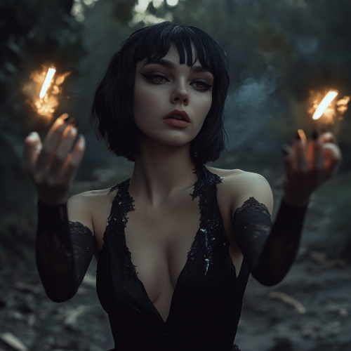 a slender young woman with black eyeshadow, short messy black hair. she is wearing a black gothic dress. she is shooting magic missiles from her hands at a monster in a pitch black haunted forest. d&d, fantasy, action scene, zoomed out and dramatic angle.