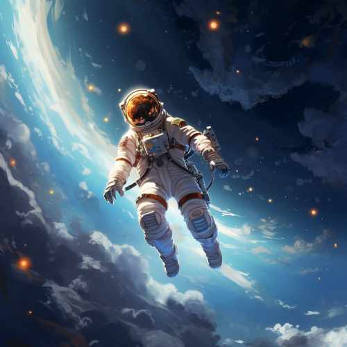 astronaut floating in space above earth working on a laptop, digital art