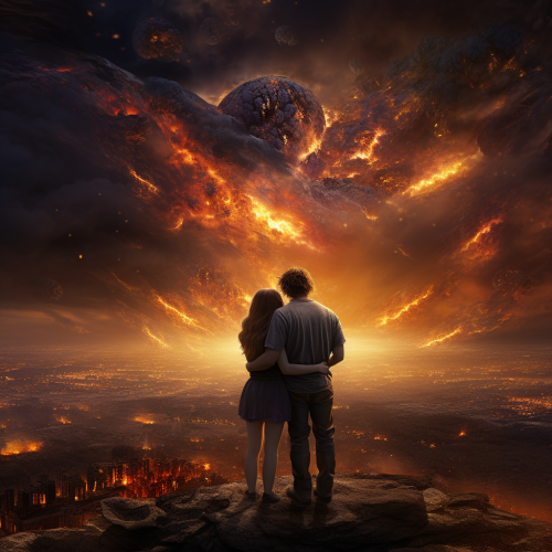 a couple hugging each other on a distant planet while watching the solar system and earth blowing up in the background close shot ultra realistic HDR