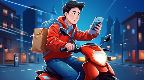 An Asian guy who delivers food, Answer the phone, On the road, Riding an electric bike, There are boxes in the car, In the city, Cartoon style, 32K, Illustration, HD --ar 16:9
