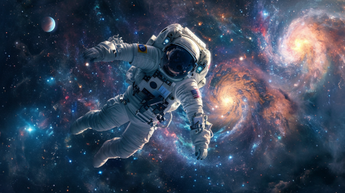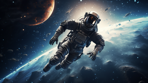 astronaut lost in space. The astronaut is floating aimlessly in the vast, star-filled expanse of the cosmos. The astronaut's suit is detailed and modern, with intricate life-support systems and a reflective visor, showing the faint reflection of distant galaxies. Around the astronaut, countless stars and several distant planets are visible, creating a sense of isolation and awe. The background is a deep, rich black, speckled with the light of far-off stars, and a nebula with swirls of blues and purples subtly illuminates part of the scene. --ar 16:9 --v 5.2