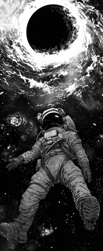 comic book art, black and white color, astronaut::1 falling through a ,solar system orbiting a black-hole::2 , nebula --ar 9:22 --v 6.0 --style raw